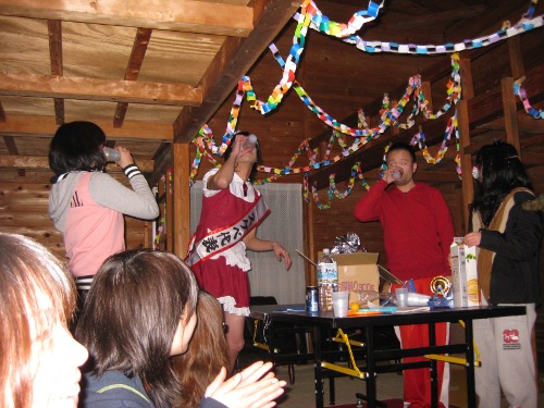 リーチになったら司会二人のどちらかにお酒をついでもらえて一緒に乾杯というルールでした。