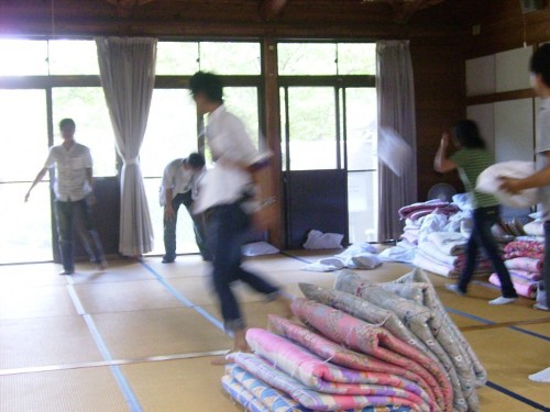 あらら、いい大人がまくら投げですよ。